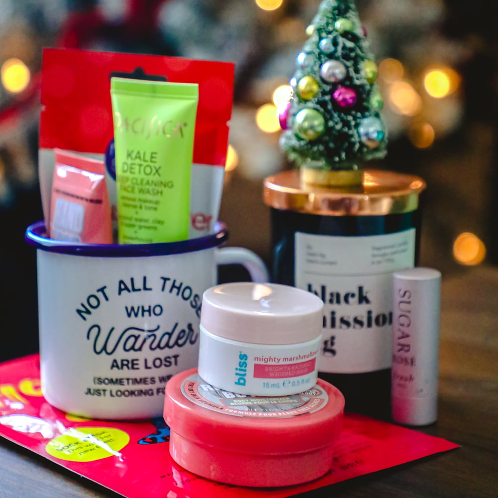We are giving away Pixi Rose Cream Cleanser, Pixi Peel & Polish, Frank Body Scrub, Rae Dunn Champagne Flutes, Too Faced Makeup (Born This Way Foundation, travel-size Hangover Primer, Better Than Sex Mascara, Natural Eyes Palette, and Mr. Right Foundation Brush, and microfiber towels and a terry cloth headband.