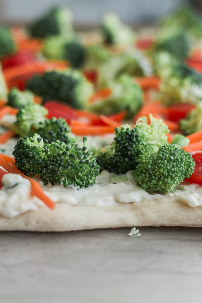 This veggie pizza recipe is so GOOD. My daughter is normally anti-broccoli, but since it is yummy pizza, she gave it a try and fell in love. It tastes like you dip carrots and broccoli in ranch dip! I made it for lunch last week to pack in my daughter’s lunch box. I kept some of it for myself for lunch.